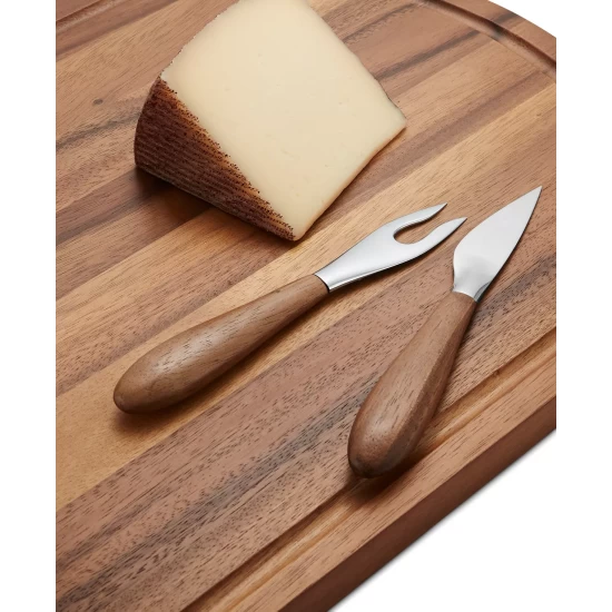 Sumptuous curves flow from stainless steel blades to wood handles on the Curvo cheese set from Nambé for a handsome addition to entertaining.