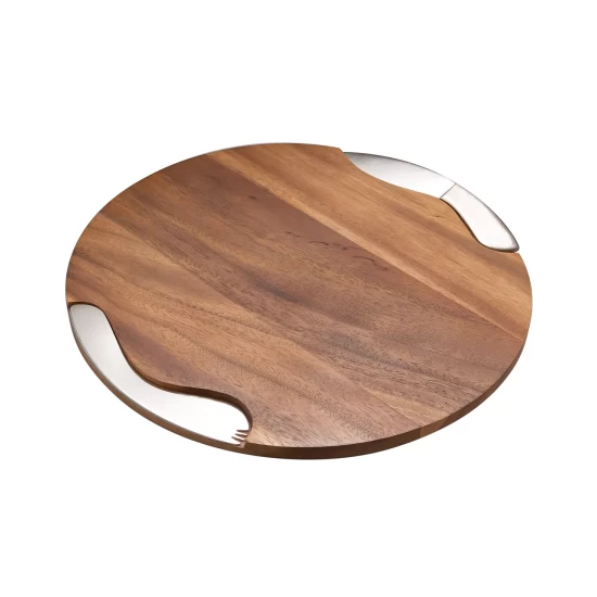 Nambe sculpts rich acacia hardwood into the ideal cheese cutting board, carved with precise storage nooks for the knife and spreader. Minimalist stainless steel utensils with lasting gleam stay put magnetically when they’re not busy slicing and serving. This collection of cheese boards is designed by Neil Cohen.