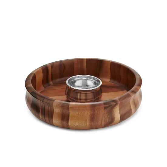 Sized for casual get-togethers with family and friends, the Nara Chip & Dip is an entertaining must-have. The bowl’s curved shape and flared opening complements any table décor, and the Alloy dip bowl can be heated or chilled prior to serving.