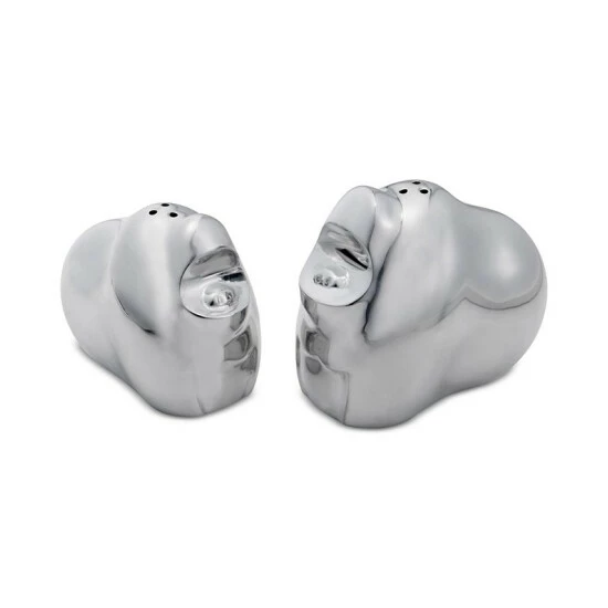 Nambé integrates form and function in the gleaming metal alloy design of the Savanna Gorilla salt and pepper shaker set.